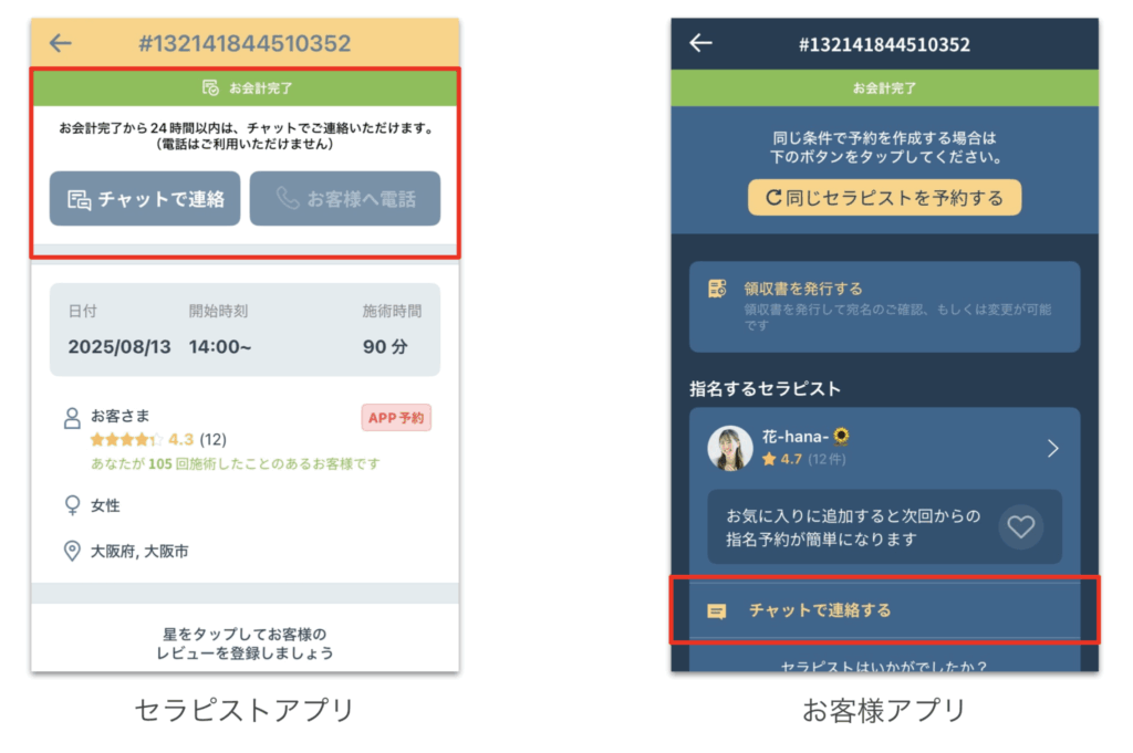 A.決済完了後でも24時間以内は、セラピストアプリからお客様アプリへ「チャット機能」のみ利用が可能でございます。