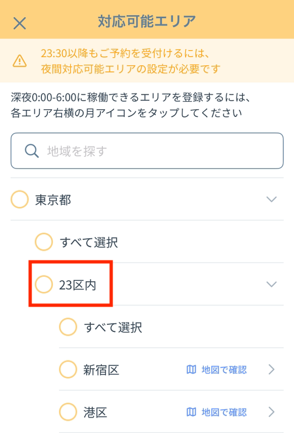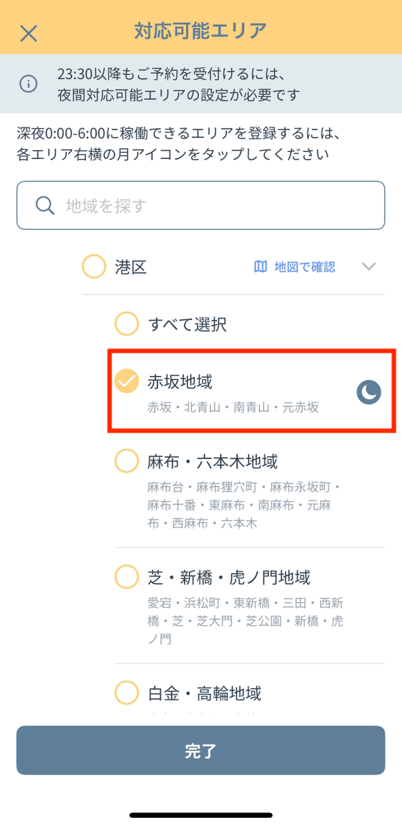 小エリア(23区・ほか行政区)を選択し、完了を押下