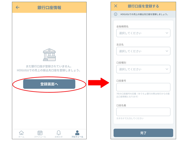 ①「登録画面へ」を押下し、口座情報を登録します。