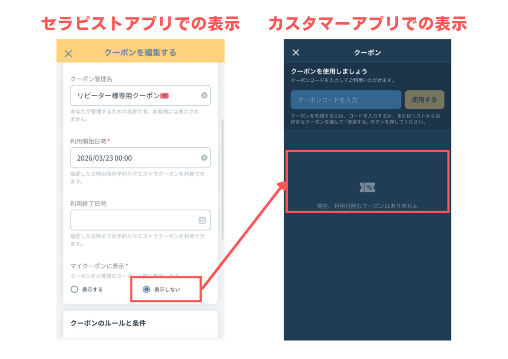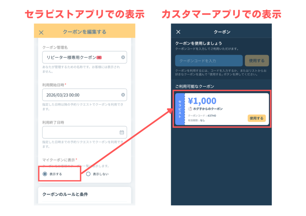 セラピストクーポン機能を使って、特定のお客様向けに「専用クーポン」を新たに発行することが可能です。