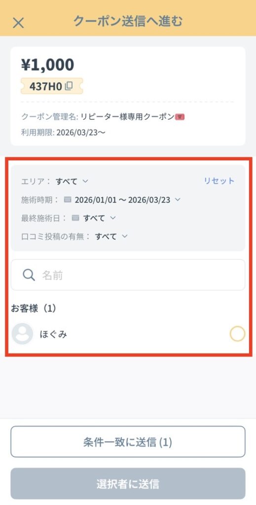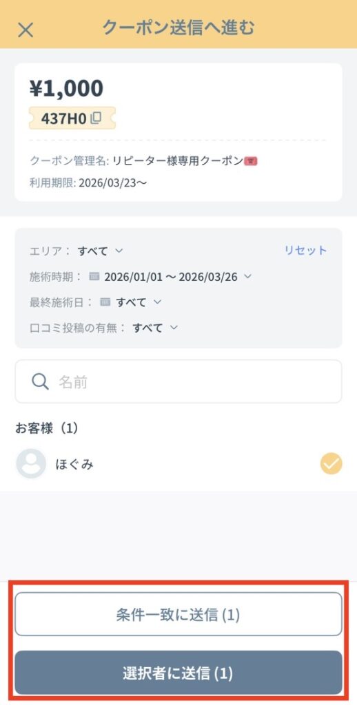 セラピストクーポンを「送る」機能を使うことで、お客様を選択したり条件を絞ってクーポンを配布することができます。