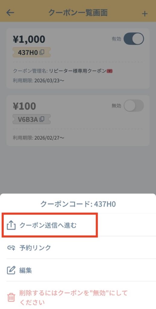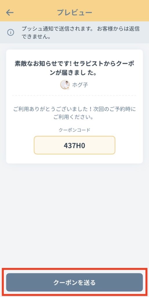 ※クーポンを送信すると、お客様へプッシュ通知でお知らせが届きます。