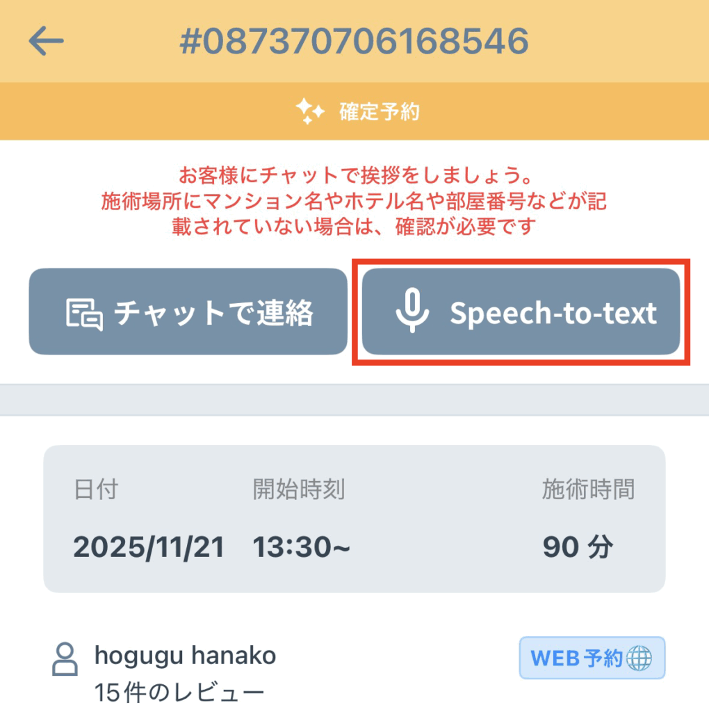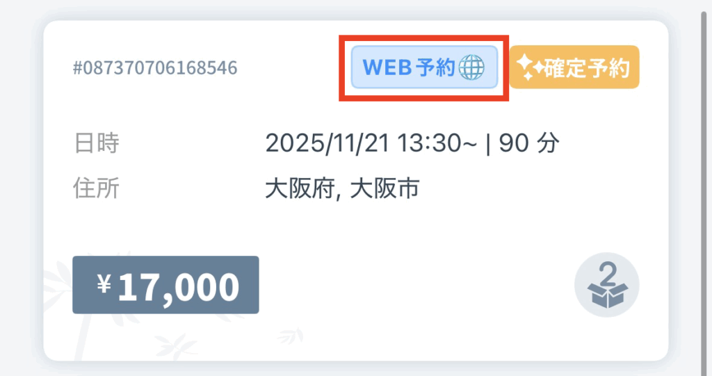Web予約(インバウンド)からのリクエストが届いた場合、セラピストアプリでは【WEB予約🌐】と表示されます。