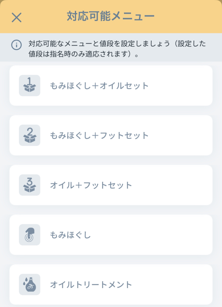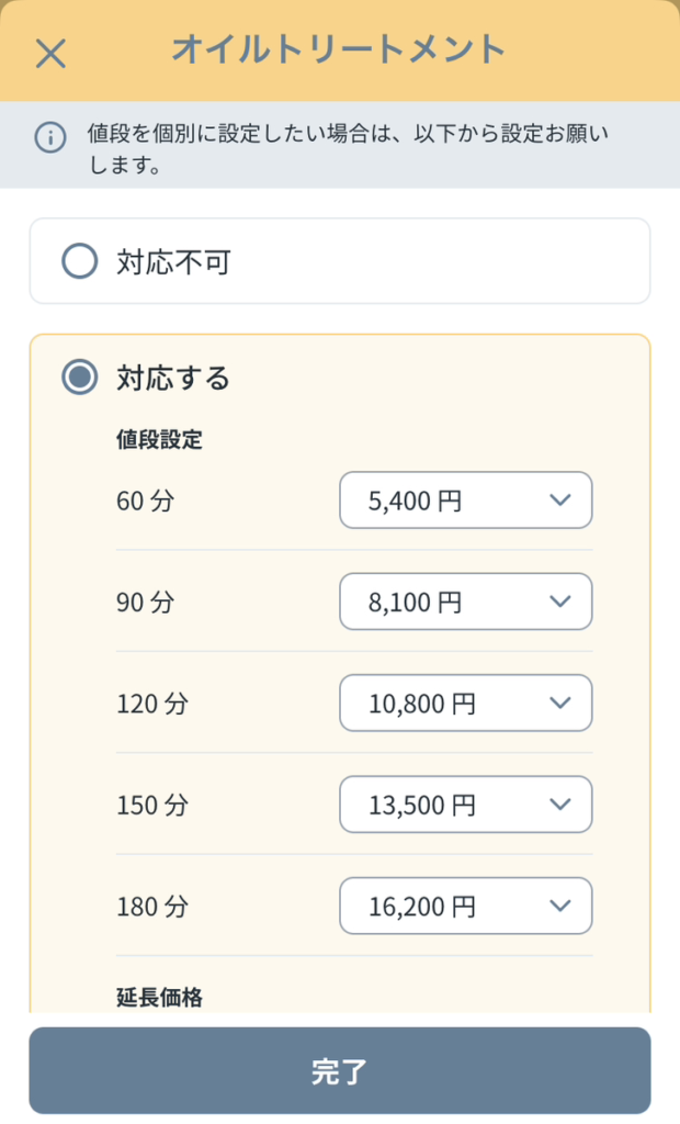施術時間は60分以上〜となっており、各コースごとに金額設定が可能です。