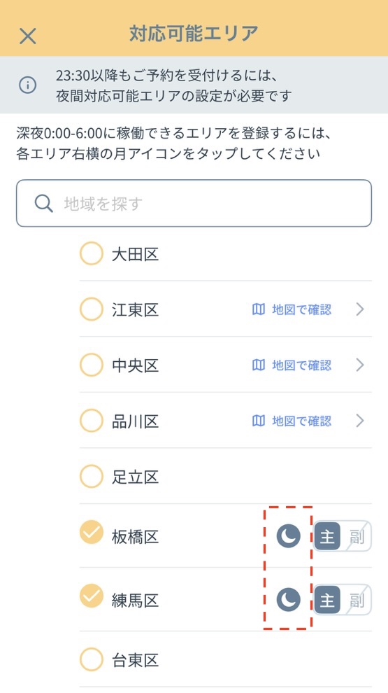 - エリア名右側の「月のマーク」をタップすると、そのエリアを「深夜帯対応エリア」として登録できます。