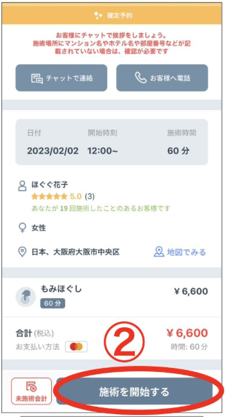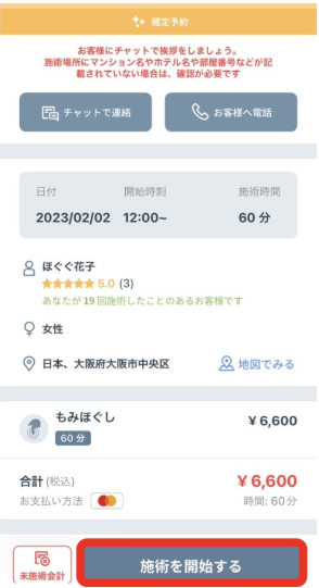 お客様と合流し施術の準備が整ったら、メニュー・金額・お客様情報が間違っていないか確認し、「施術を開始する」をタップしましょう。
