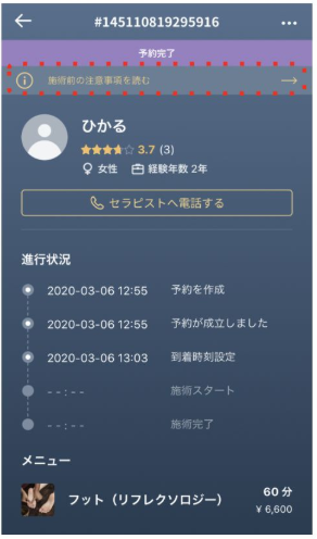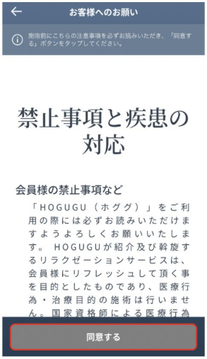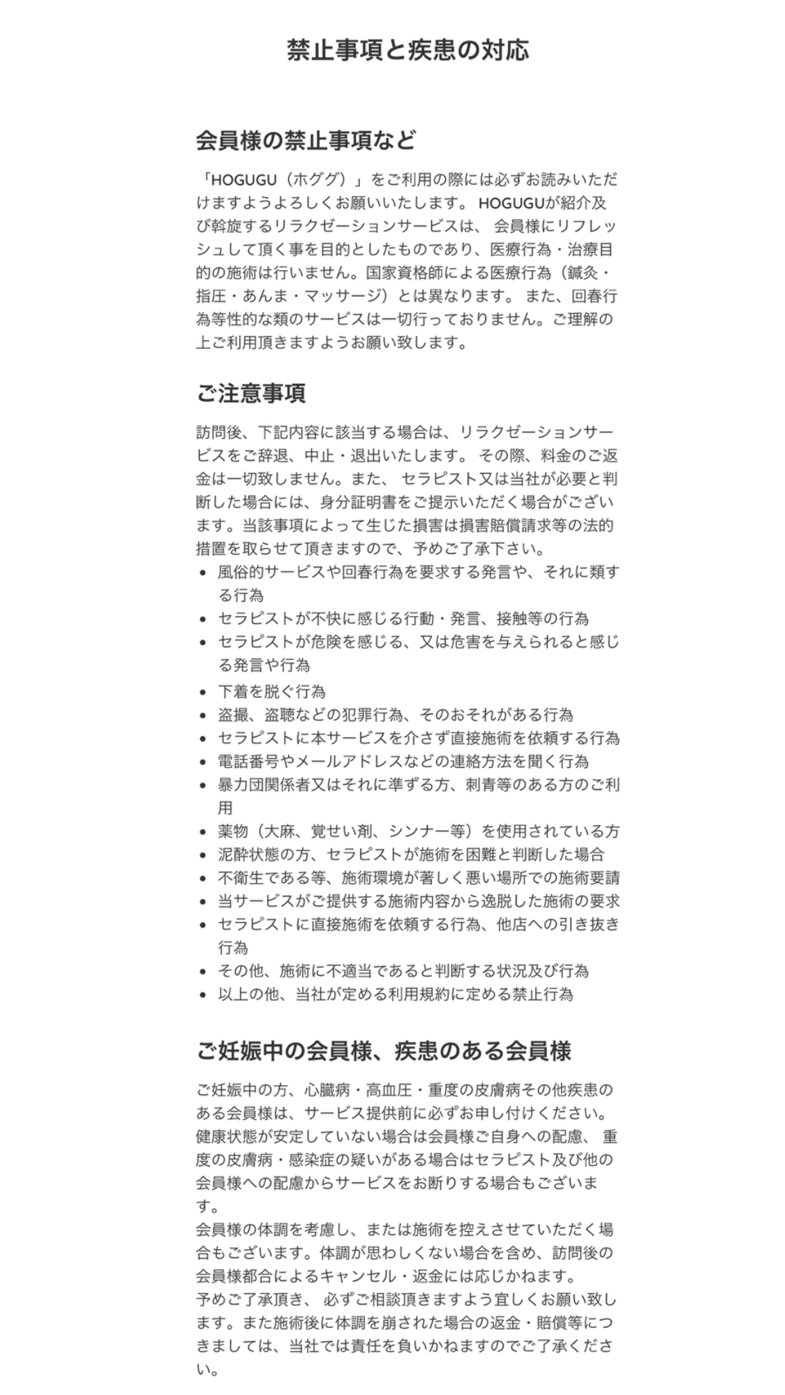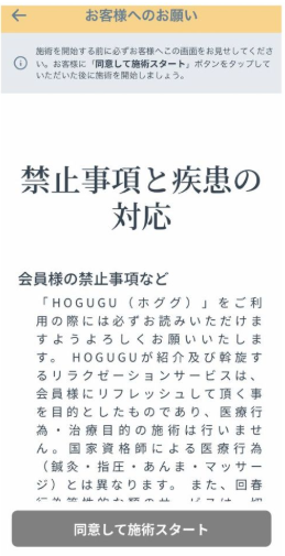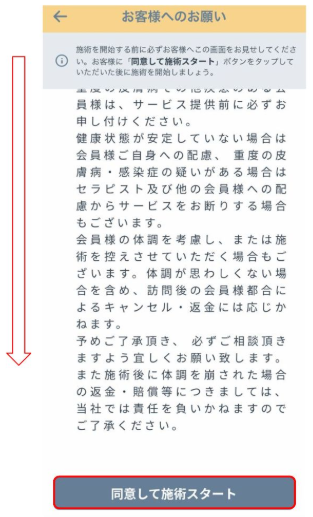 同意ボタンをセラピストがタップする、または施術開始と同時刻で施術を完了させた場合で施術によるトラブルが発生した場合、弊社は一切関与致しません。