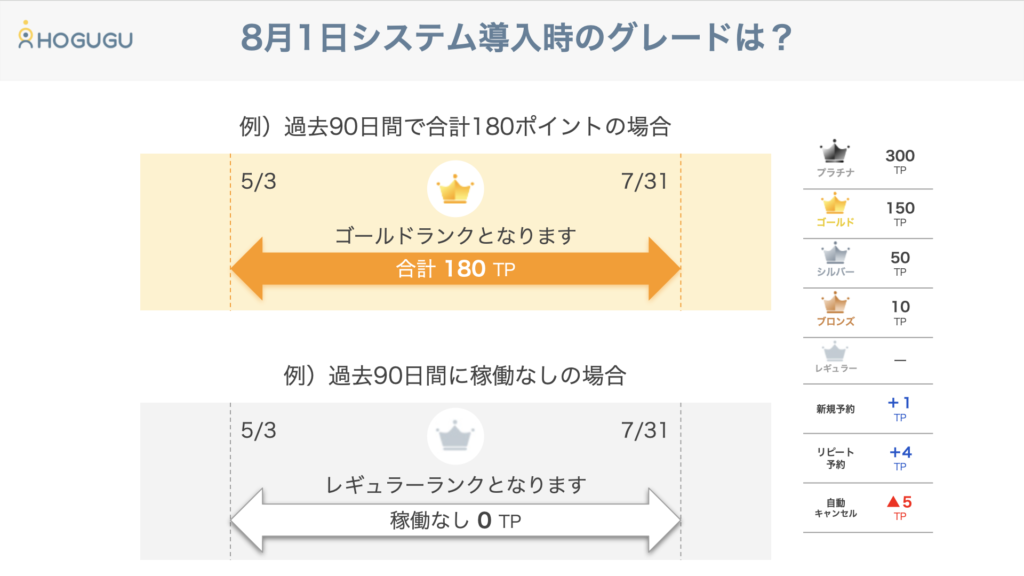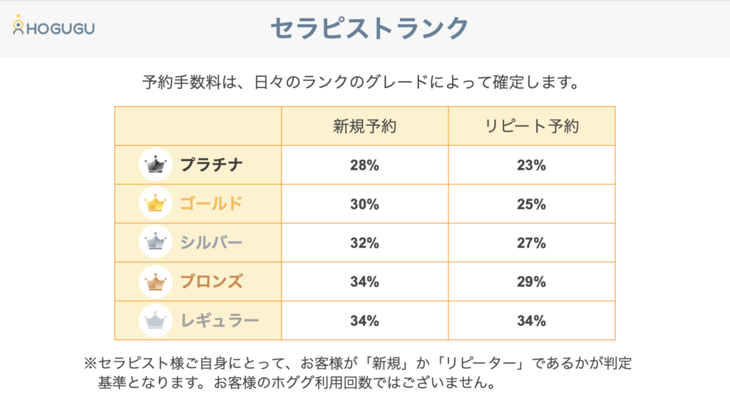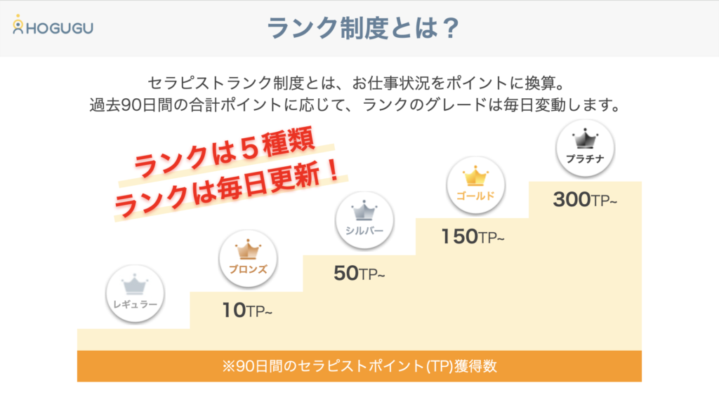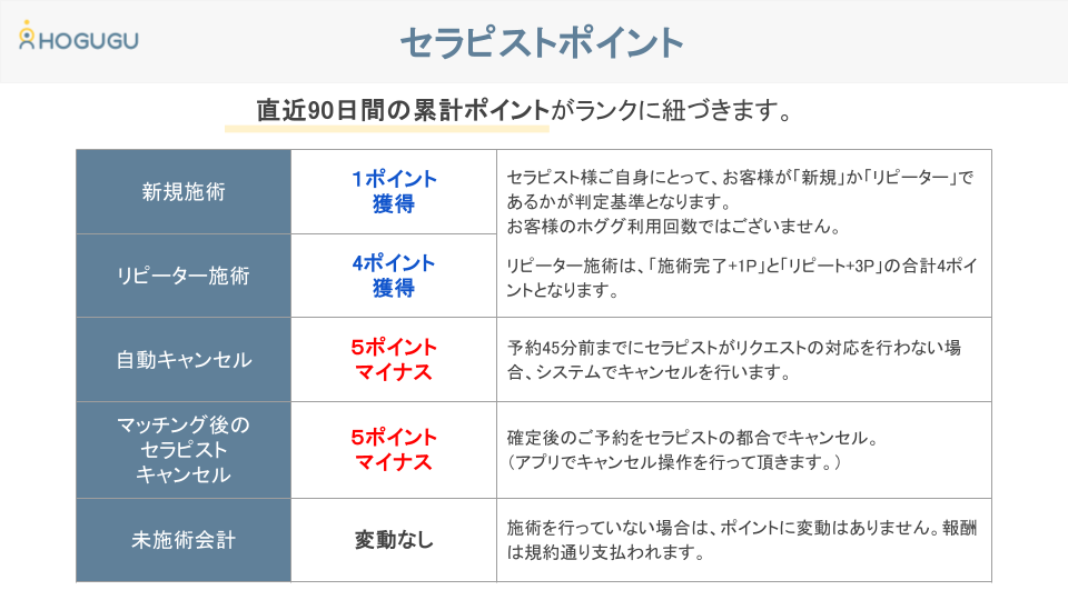 | まだアプリセラピストになったばかりです。 登録日から90日間に満たない場合、ランクはどうなりますか? あくまで、ランクの判定期間を過去90日間としております。 ホググを始めてすぐのセラピスト様もポイント獲得数に応じてランクアップが可能です。 |