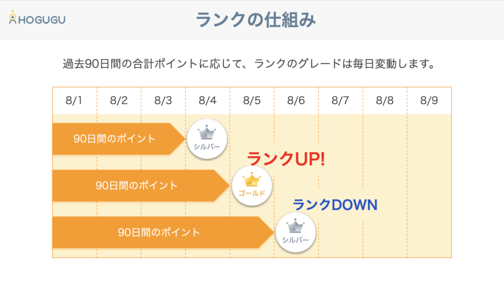 | ランクはどうやって決まりますか? 過去90日間の合計ポイントに応じて、ランクのグレードは毎日変動します。 |